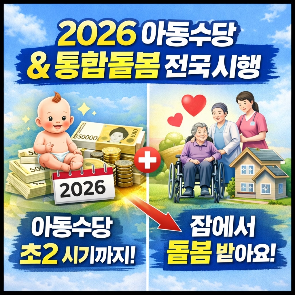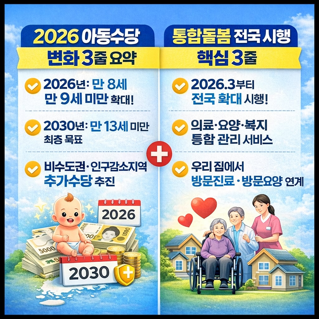 2026년 아동수당(만 9세 미만 확대) + 통합돌봄 전국 시행(2026.3) 한 번에 정리